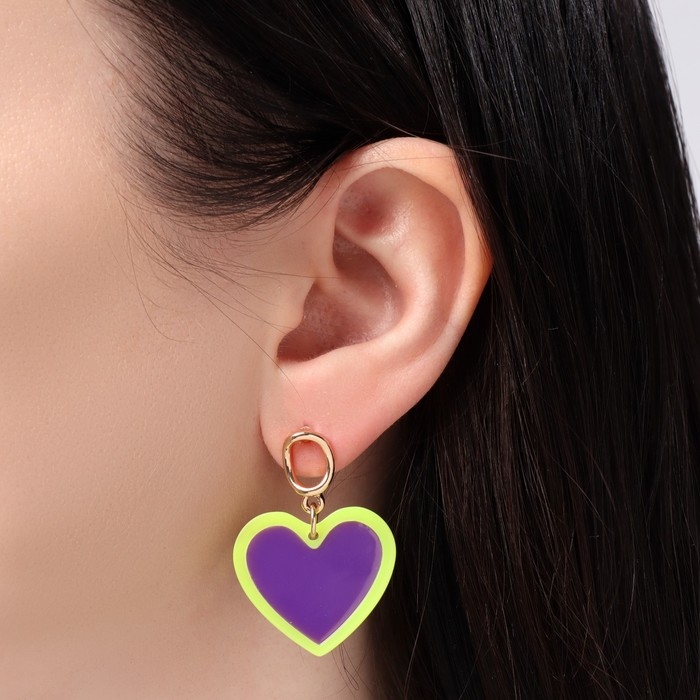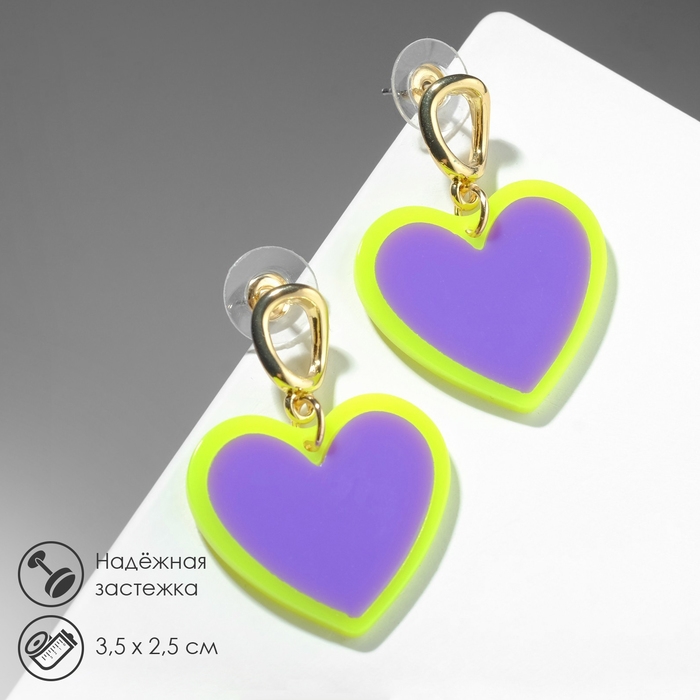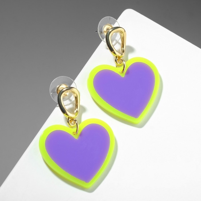 Серьги акрил «Сердечки» неоновые, цвет фиолетово-салатовый в золоте
