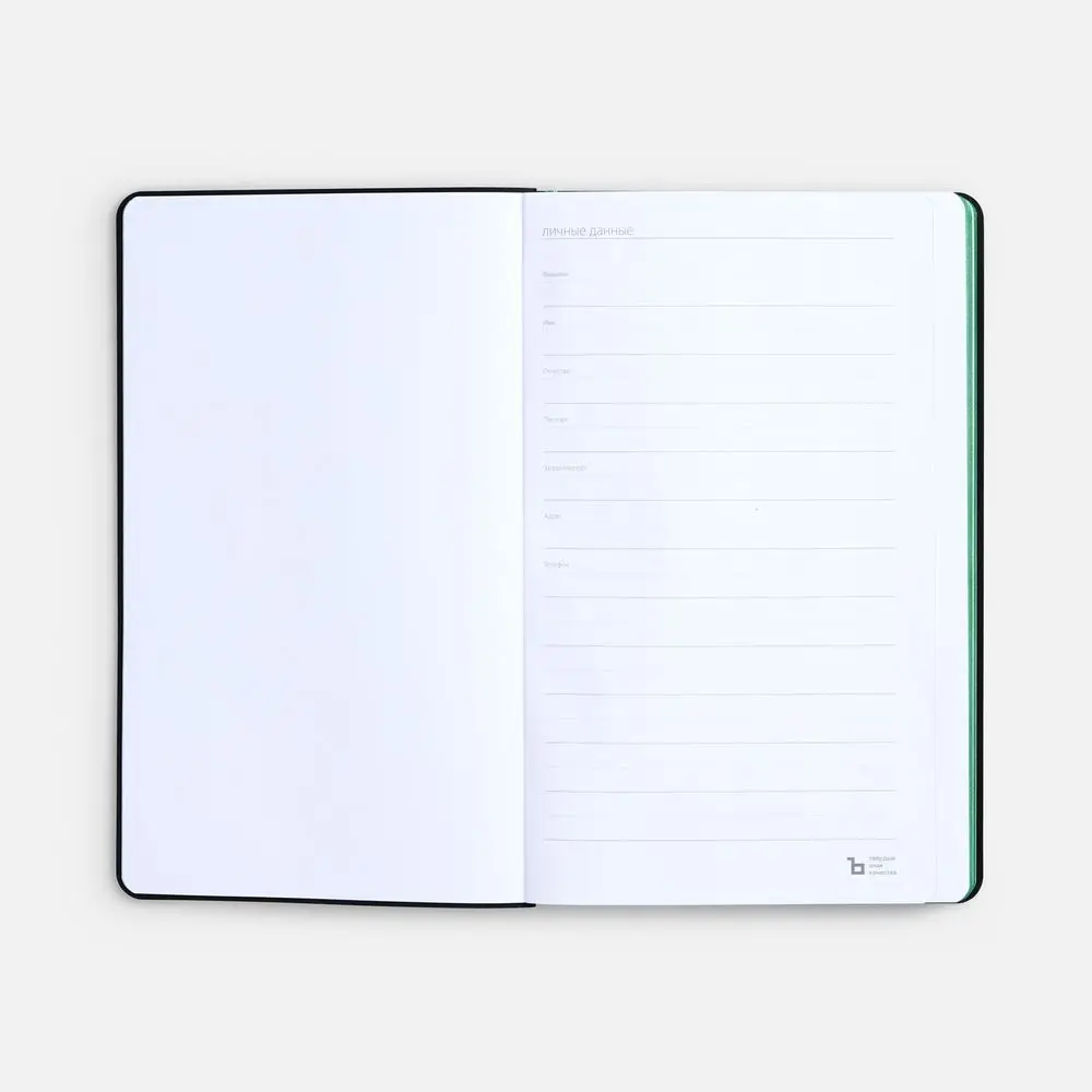 Ежедневник с гибкой обложкой выполнен из материала Nice Touch, черный АА и Soft Touch Ultra, зеленый FF, дополнен ляссе зеленого цвета.
