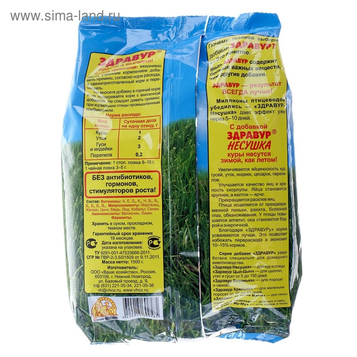 Добавка «Здравур Несушка» укрепляет здоровье кур, защищает от заболеваний: авитаминоза, обезноживания, каннибализма. У кур улучшается аппетит, состояние перьевого покрова, они становятся бодрыми и веселыми. Элементы, содержащиеся в «Здравур Несушке», активизируют обменные процессы в организме кур, именно поэтому уже через 7–10 дней Вы увидите реальный результат — яйценоскость кур повысится, скорлупа станет прочнее. Кроме того, «Здравур Несушка» помогает сэкономить корма! Специальные кормовые ферменты, содержащиеся в ней, повышают усвоение организмом питательных веществ из корма. Благодаря этому ни один грамм кормов не тратится зря! «Здравур Несушка» очень выгодна в применении: курице в день требуется всего 1 г добавки, а прибавка яиц составит до 5–6 штук в неделю. Добавка «Здравур Несушка» не содержит антибиотиков, ГМО, химических стимуляторов роста, поэтому яйца остаются такими же «чистыми», вкусными и полезными, как при кормлении только обычными кормами.