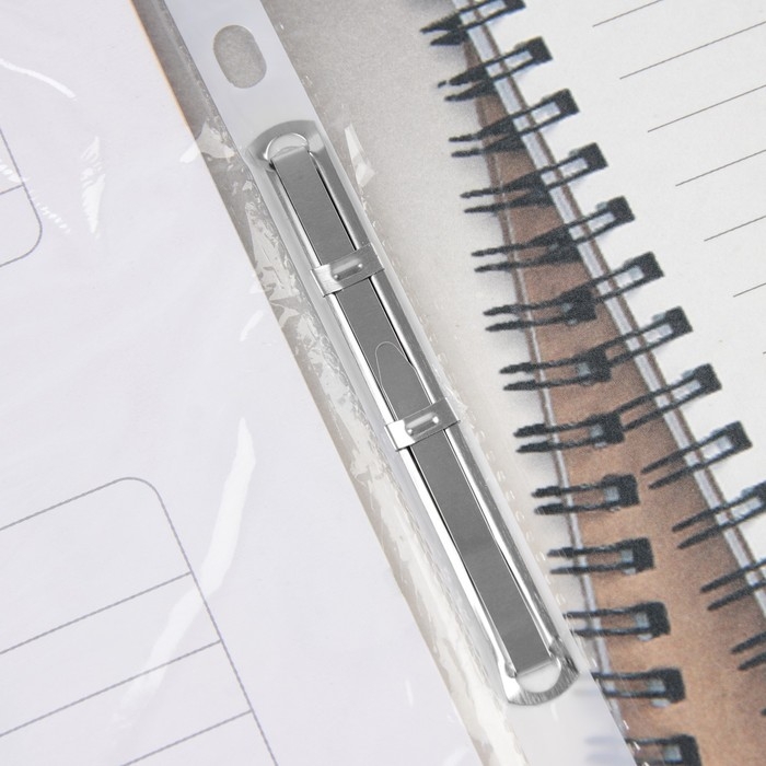 В набор входит: папка со скоросшивателем и 5 двухсторонних листов-разделителей (мелованная бумага 157 гр/кв.м). Обложка выполнена из картона плотностью 300 гр/кв.м, внутри есть крепление, на которое следует цеплять файлы.