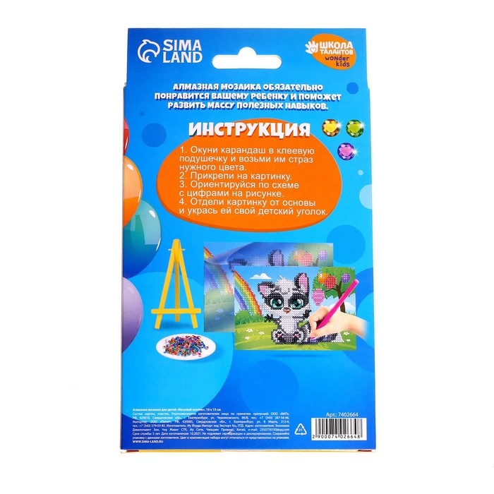 Ребёнку предстоит разложить кристаллики карандашом по пронумерованной схеме, заполнив всё полотно. Основа с клеевым покрытием будет надёжно удерживать стразы. На ней уже обозначены необходимые оттенки, а цветовая таблица расположена на упаковке.