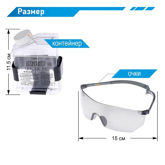 - Размер очков: 15 × 13,5 × 4,5 см.