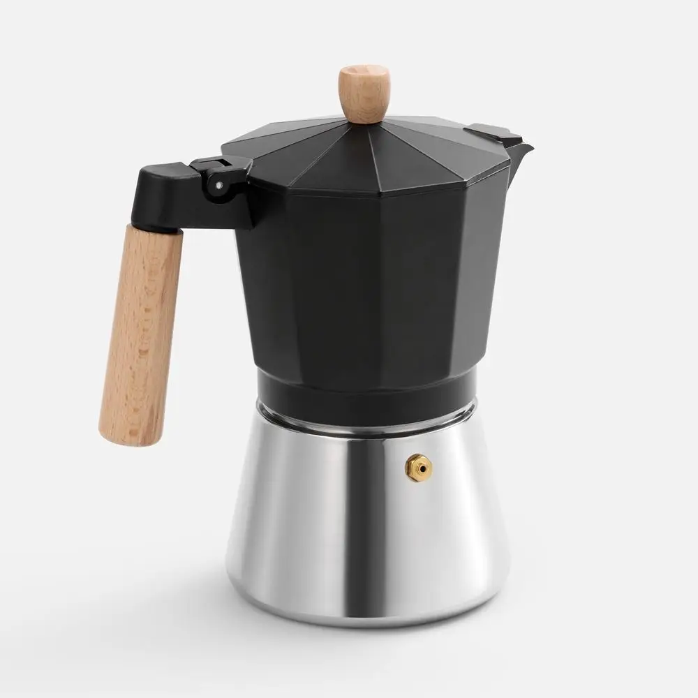 Верхняя часть выполнена из окрашенного алюминия, а нижняя — из нержавеющей стали с зеркальной полировкой, что обеспечивает долговечность и стильный внешний вид. Удобная деревянная ручка не нагревается, гарантируя комфорт и безопасность при использовании. Эта кофеварка быстро и легко приготовит классический эспрессо, позволяя сполна наслаждаться свежим крепким кофе.