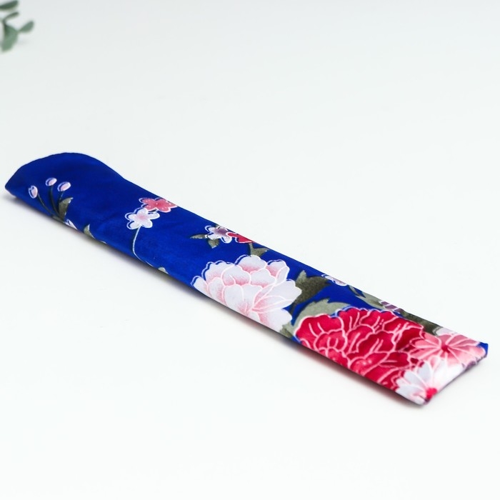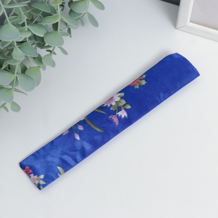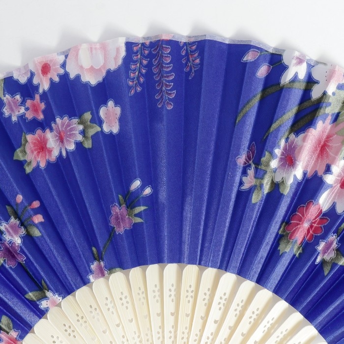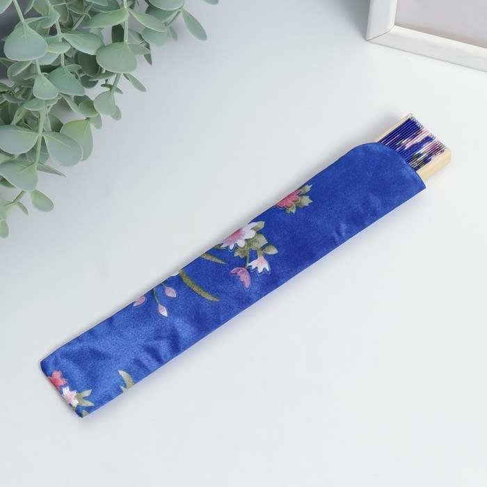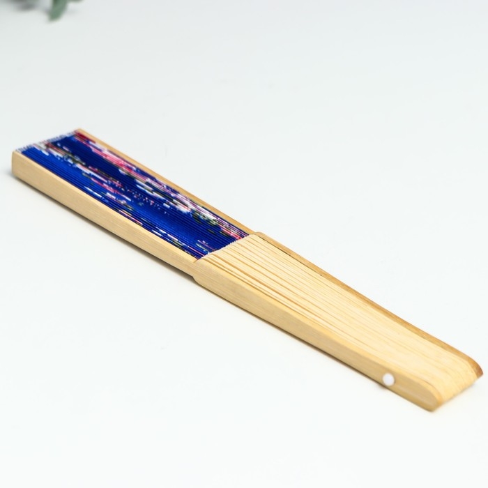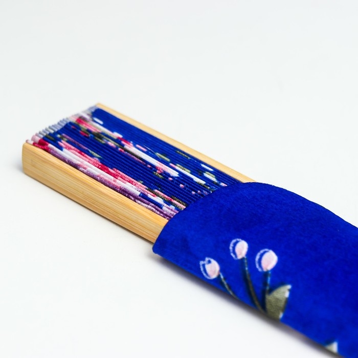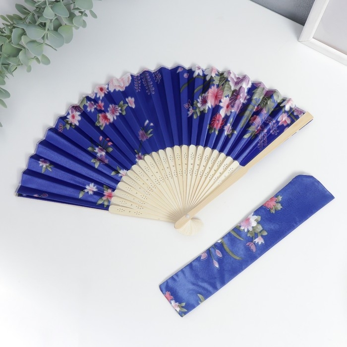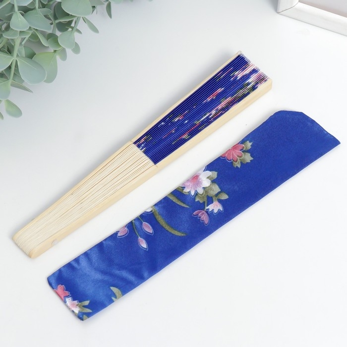 Веер бамбук, текстиль h=21 см "Цветы" с чехлом, синий