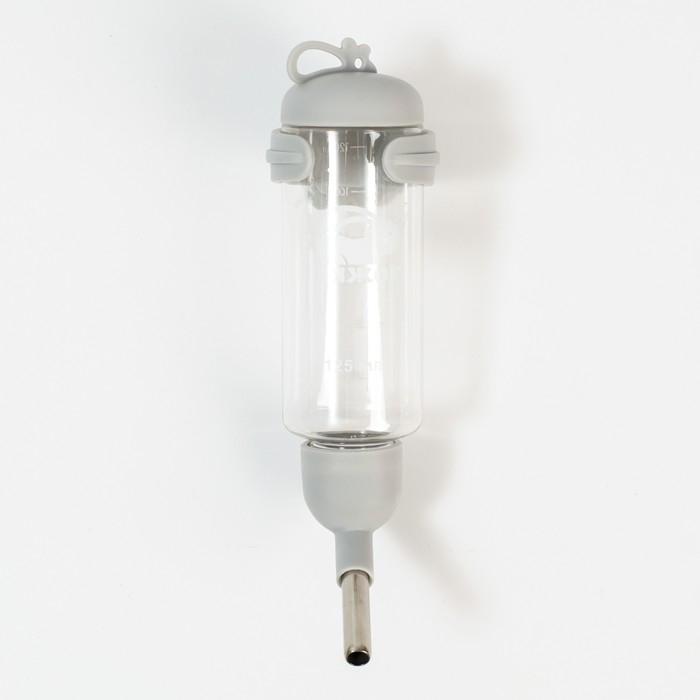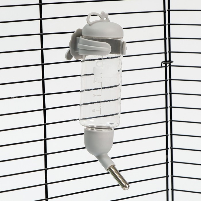 Поилка крепится между прутьев клетки, оснащена носиком из нержавеющей стали с металлическим шариком, который препятствует вытеканию воды.