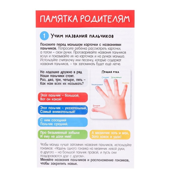 - Проговорите названия всех пальчиков, покажите их на карточках и на руках ребёнка.