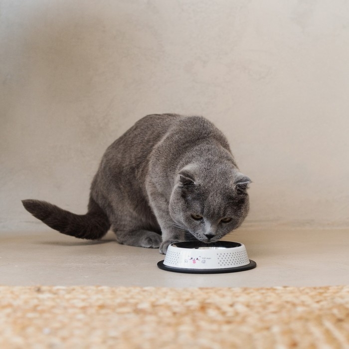 Миска для кошек сделана из нержавеющей стали, её легко мыть, она долговечна, подходит для еды и воды. Изделие имеет нескользящую резинку по окружности дна — ёмкость не будет скользить и перемещаться во время приёма пищи.
