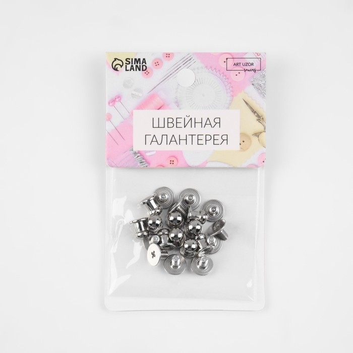 В наборе 10 штук серебряного цвета. Диаметр шляпки 5 мм; диаметр основания 6 мм; высота 8 мм.