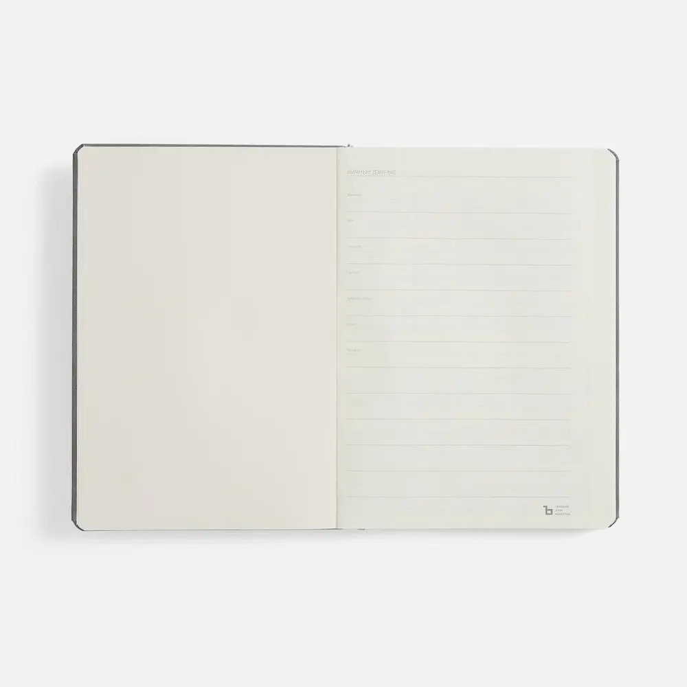 Ежедневник с твердой обложкой, выполнен из материала Nubuck Touch, серый СС, дополнен ляссе темно-серого цвета.