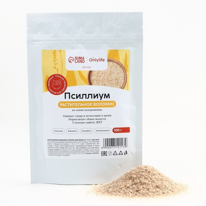 Onlylife Псиллиум из семян подорожника, источник клетчатки, снижение сахара и холестерина в крови, нормализует обмен веществ, 100 г.
