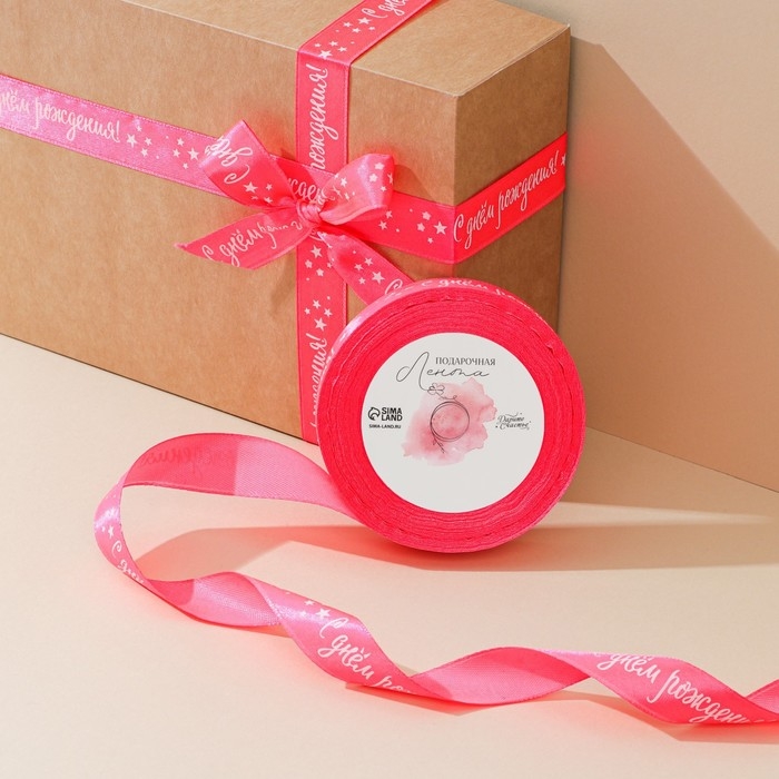Лента атласная, подарочная упаковка, «С днём рождения», розовая, 2 см х 22.5 м