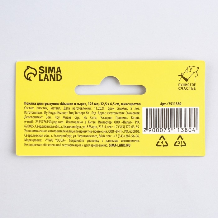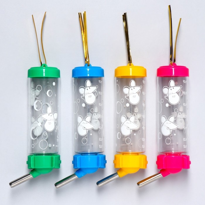 Поилка для грызунов «Мышки в сыре» 125 мл, 12.5х4.5 см, микс цветов