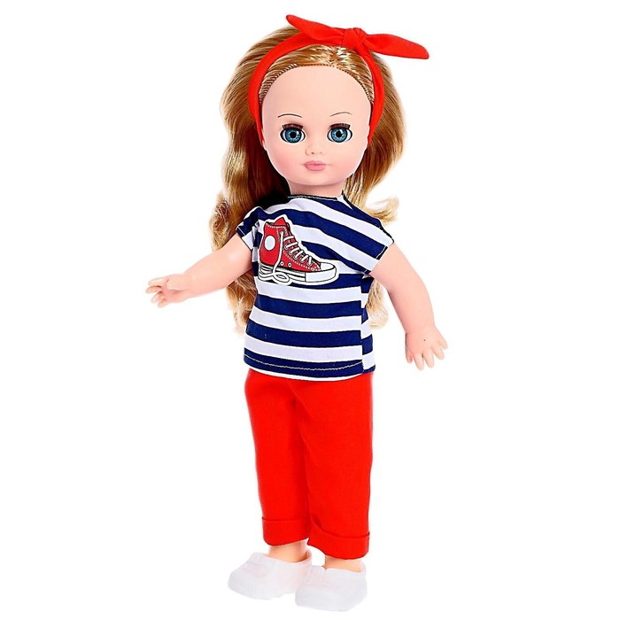 - В комплект одежды входит: футболка в полоску с наклейкой и брючки. Голову украшает ободок-бант в тон брюк, кроссовки.