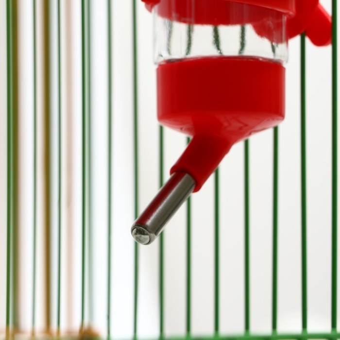 Поилка крепится между прутьев клетки, оснащена носиком из нержавеющей стали с металлическим шариком, который препятствует вытеканию воды.