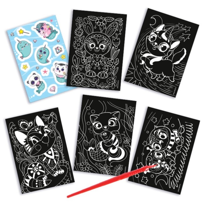 С помощью штихеля нарисуйте что-нибудь на листе: инструмент будет соскребать верхний тёмный слой. Под чёрным фоном скрывается сияющее покрытие, которое сделает ваши рисунки сказочными.