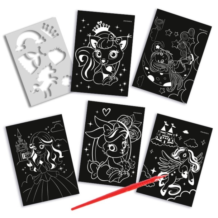 С помощью штихеля нарисуйте что-нибудь на листе: инструмент будет соскребать верхний тёмный слой. Под чёрным фоном скрывается сияющее покрытие, которое сделает ваши рисунки сказочными.
