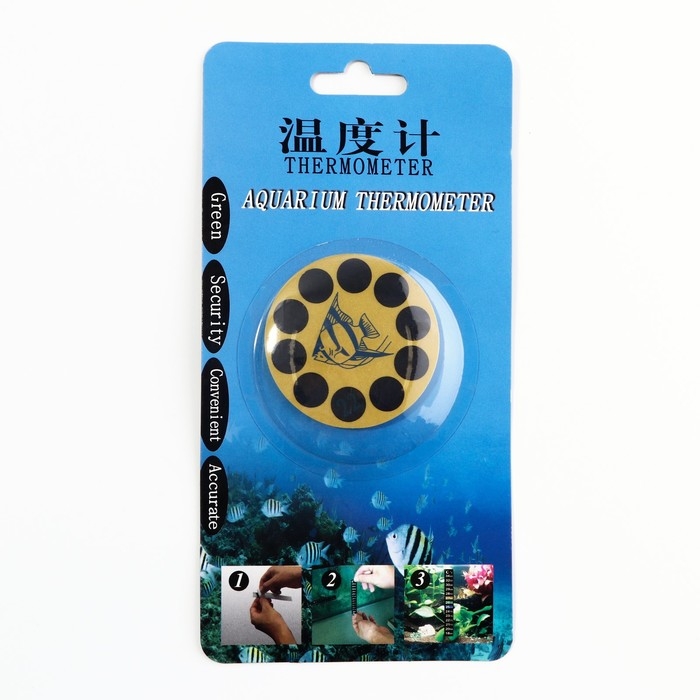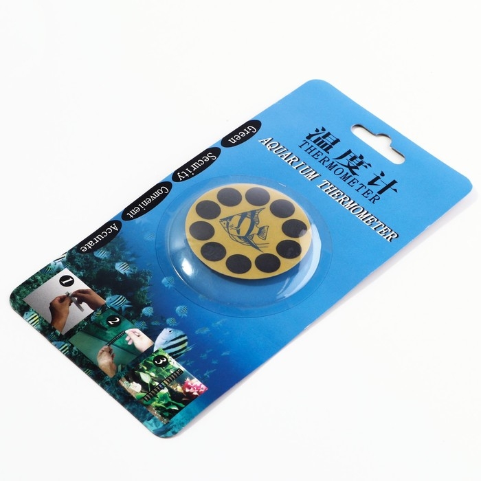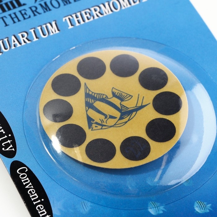Жидкокристаллический термометр для измерения температуры воды в аквариуме. Простое крепление на внешнюю поверхность стенки аквариума с помощью клеевого слоя на изнаночной стороне термометра. Измерение температуры в диапазоне от 18 до 36 градусов С. Прост в использовании, долговечен, легко моется, изготовлен из нетоксичных материалов.