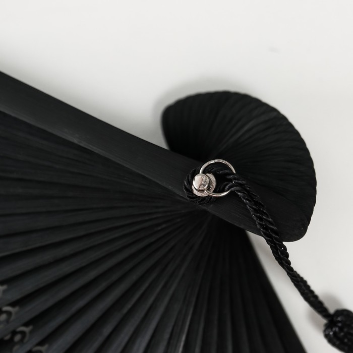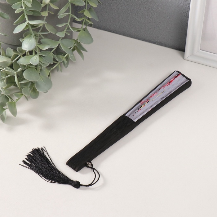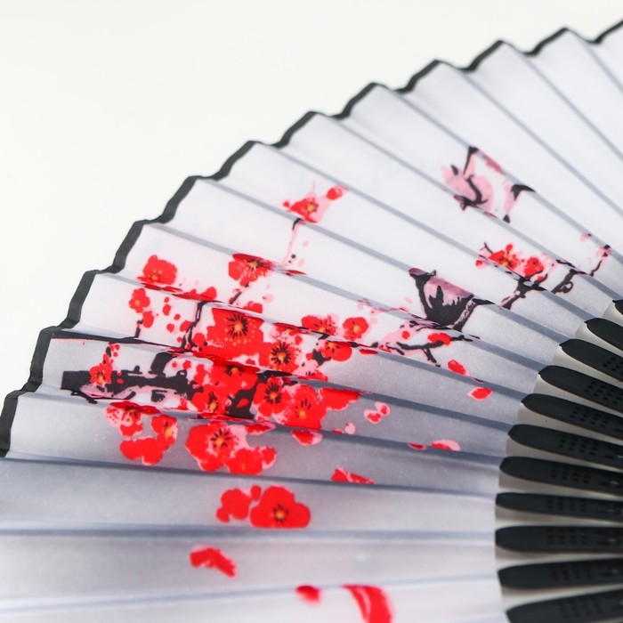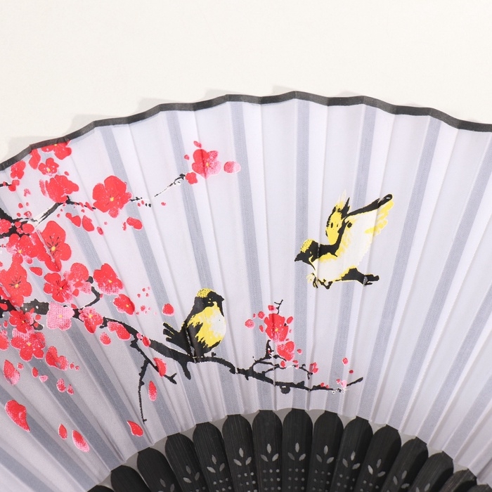 Веер бамбук, текстиль h=21 см "Красная сакура с птичками" белый, с кисточкой