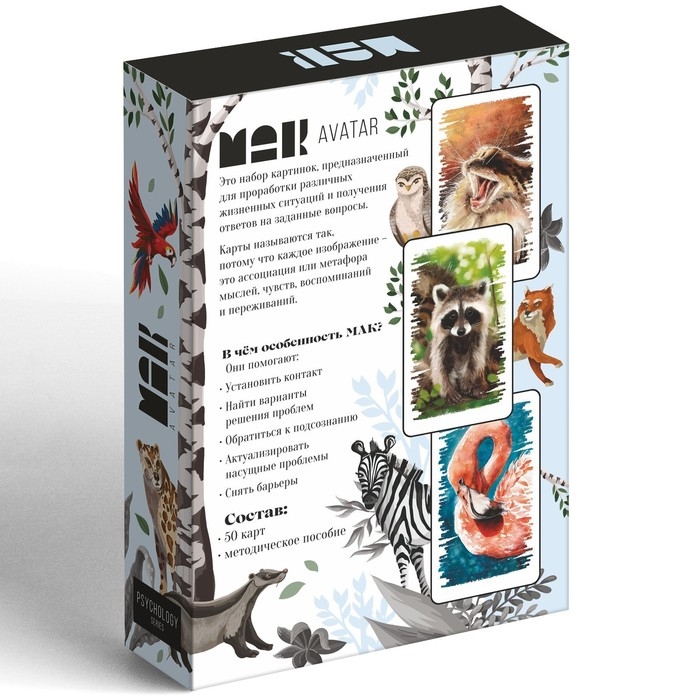 Метафорические ассоциативные карты (МАК) – это набор картинок, которые помогут заглянуть вглубь подсознания и получить ответы на интересующие вопросы. В данной колоде изображены животные и неспроста, ведь человека и животного связывает множество нитей: культурных, исторических и бытовых. Это и метафорическая связь, позволяющая обозначить человека через образ животного. Карты помогут исследовать себя, открыть и признать свои разные стороны и способности, найти внутренние ресурсы.