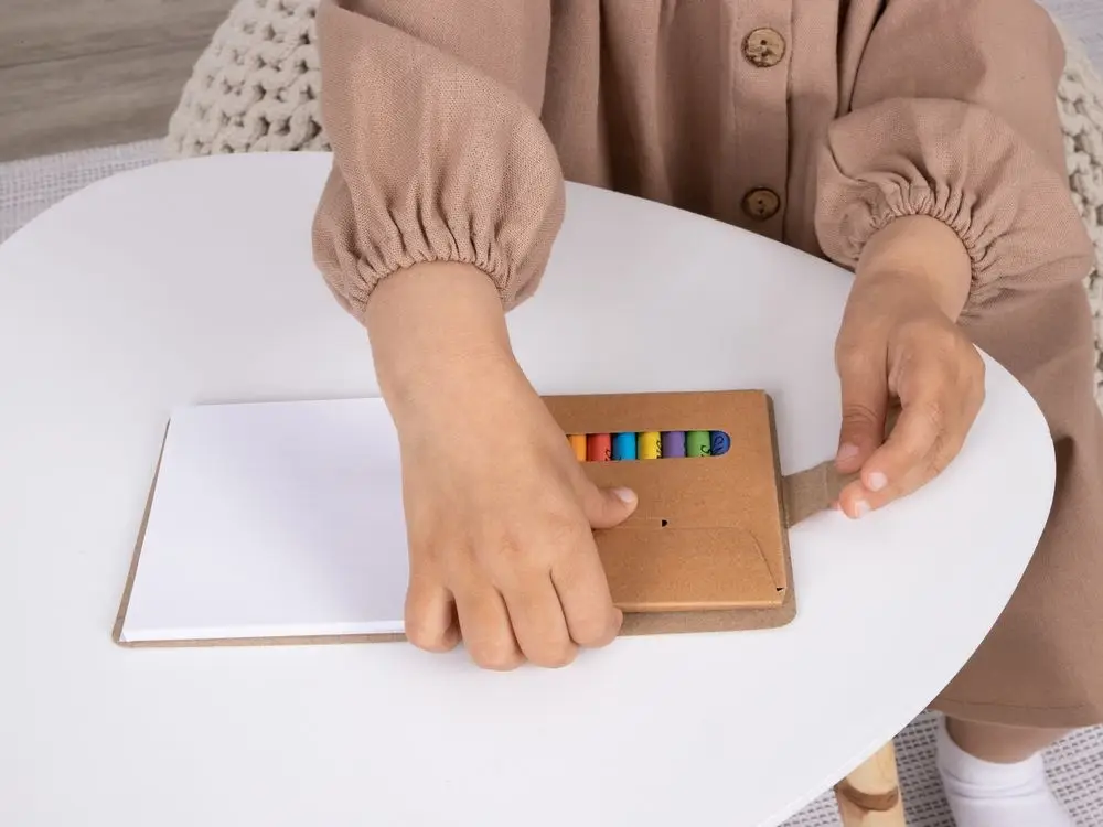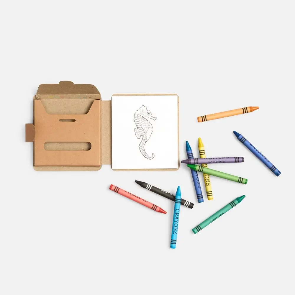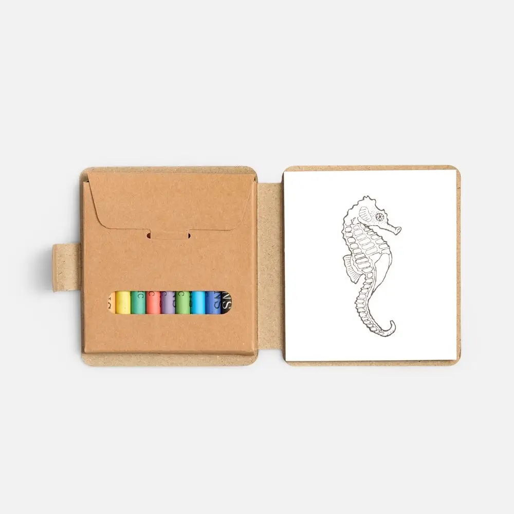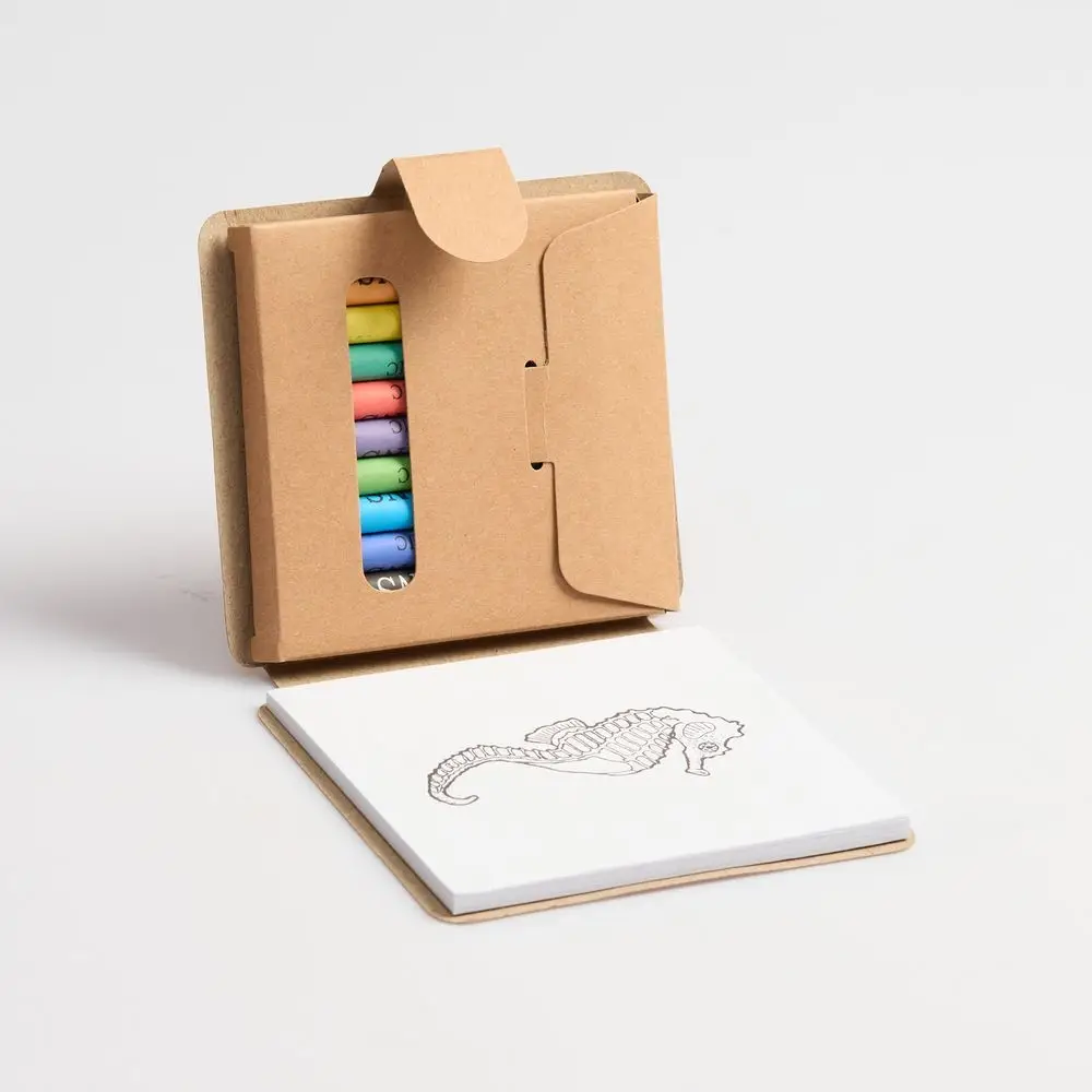 В комплекте 10 цветных восковых мелков и блокнот на 40 страниц для раскрашивания и рисования: 12 страниц с рисунками и 28 чистых страниц. Блокнот и мелки компактно хранятся под одной обложкой.