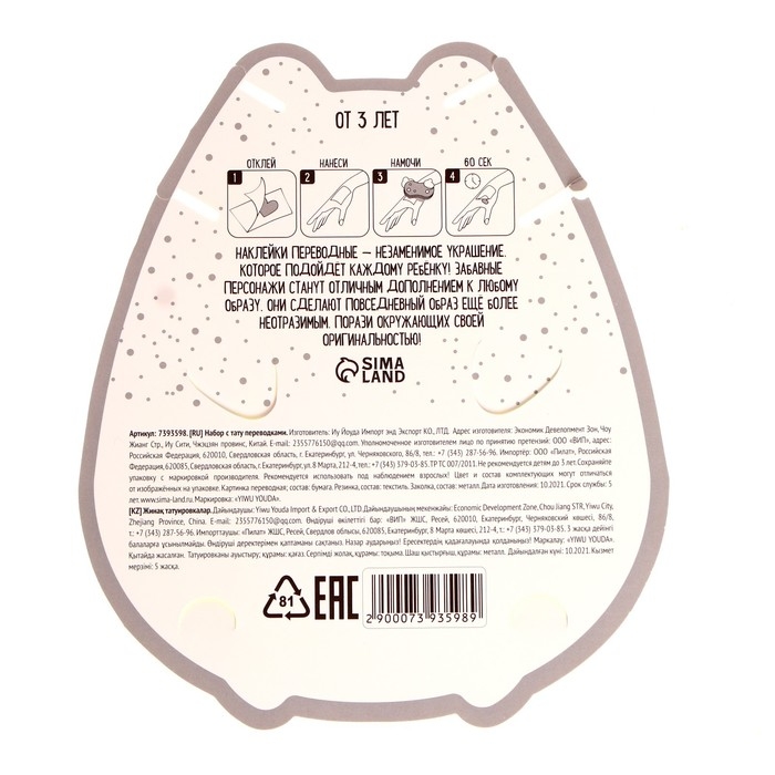 Внимание! Возможна индивидуальная реакция на участке нанесения татуировки. Рекомендуем следить за состоянием кожи в период использования. После снятия татуировки промойте кожу водой и нанесите тонкий слой увлажняющего крема.