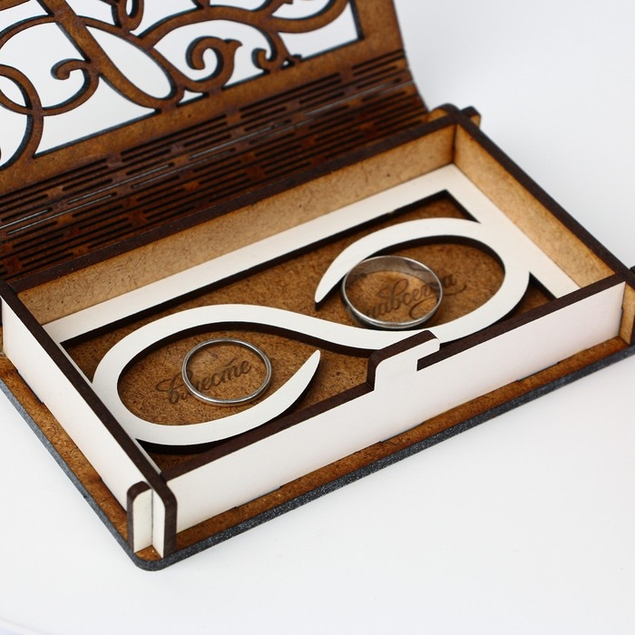 Шкатулка под парные кольца - это лучший подарок на свадьбу молодоженам. Свадебный футляр из дерева с крышкой подойдет под набор колец разной ширины и размера. Подставка для украшений вмещает широкое и тонкое, крупные и маленькие колечки из золота, с камнями и без. Коробка ручной работы с гравировкой подойдет для праздника дня святого валентина, на годовщину и для помолвки под золотые ювелирные изделия и бижутерию, а также под помолвочное кольцо. Подарочный кейс для драгоценностей в оригинальном дизайне приятно держать в руках. Это коробочка для кольца, которая дарит приятные воспоминания. Изящный органайзер для украшений дополнит свадебные фото и украсит церемонию бракосочетания или венчания.