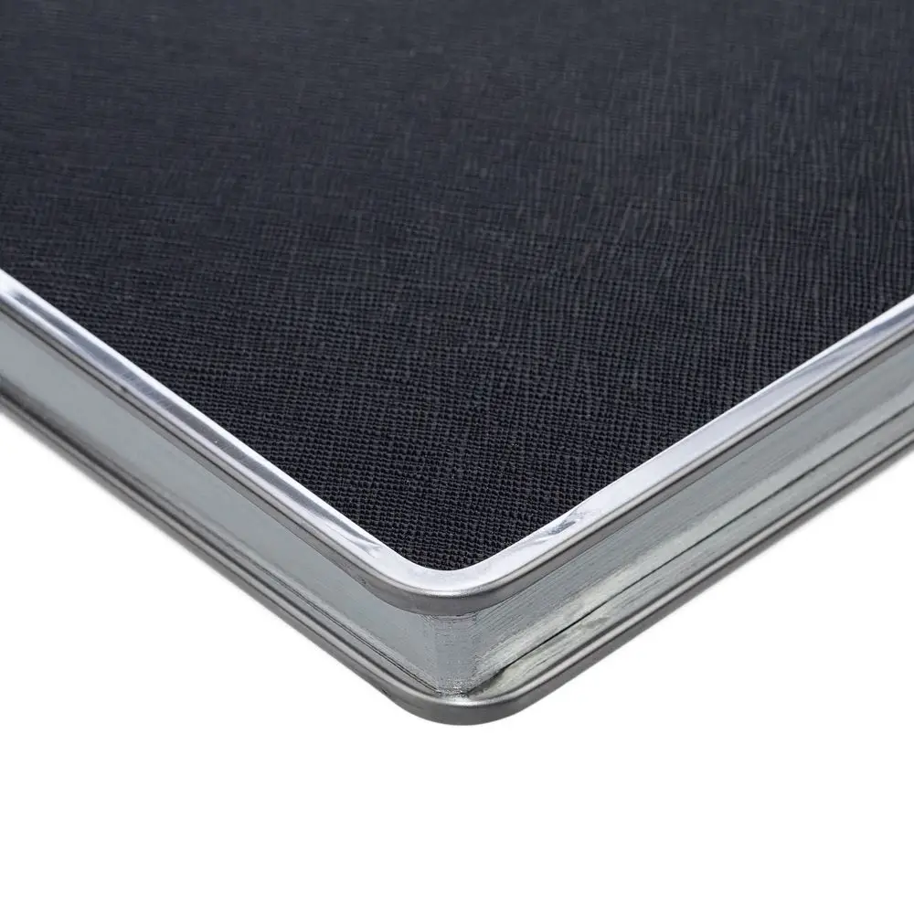 Ежедневник с твердой обложкой и серебристым обрезом, выполнен из материала Saffian, черный, дополнен серым ляссе и металлическими рамками.