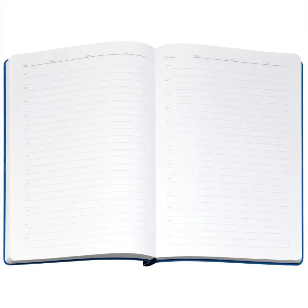Ежедневник с гибкой обложкой выполнена из материала Nice Touch, синий и Latte, синий (внутренняя часть обложки), дополнен горизонтальной резинкой в цвет обложки. Внутри корешка — специальное место для крепления ручки размером до 15х1 см.