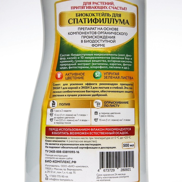 Удобрение жидкое "БИО-комплекс", "Биококтейль" для спатифиллума, 0,5 л