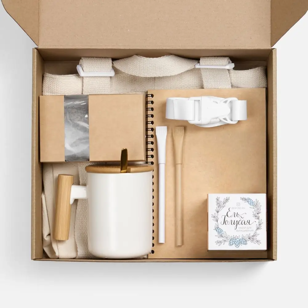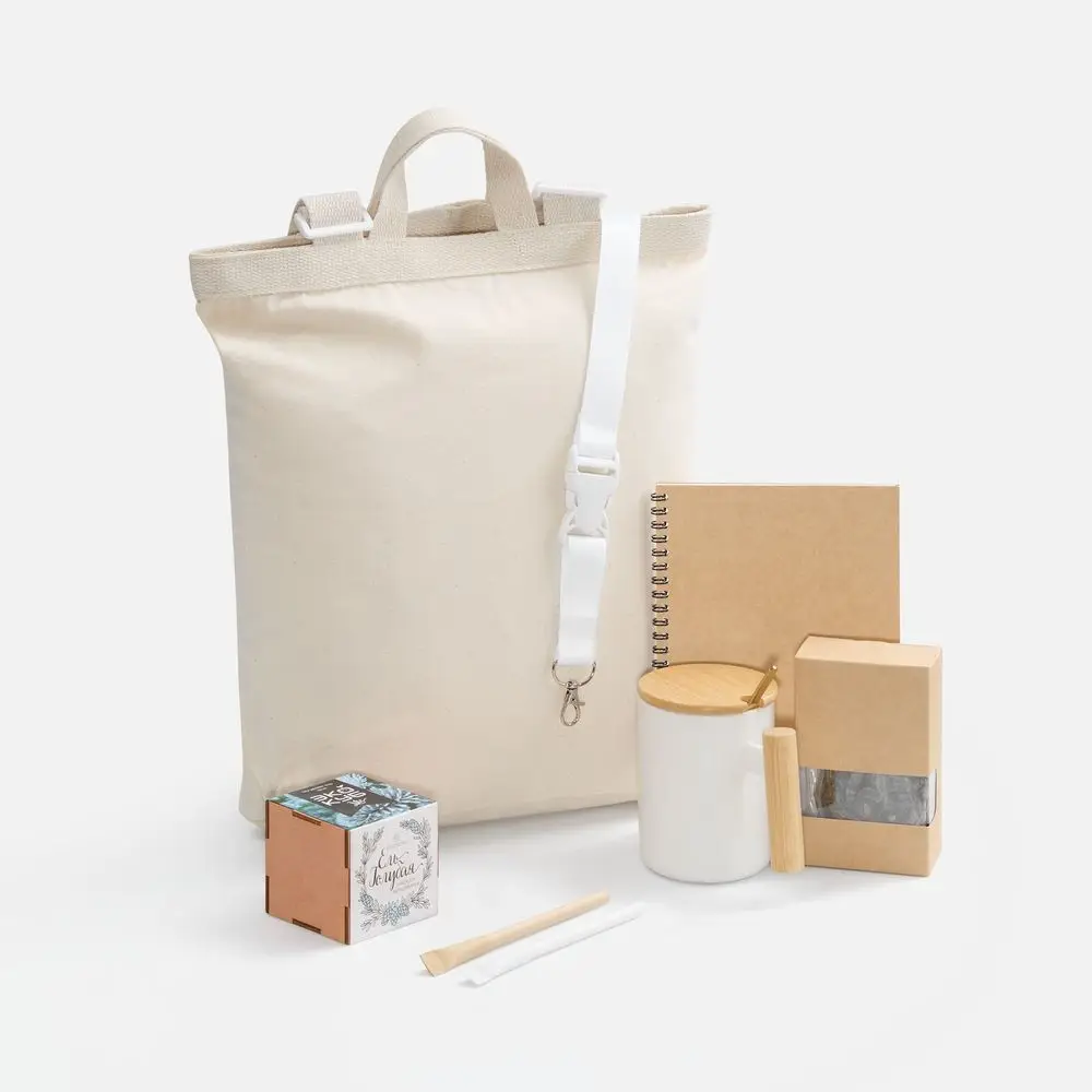 Think Green — готовое экологичное решение для приветственного набора. Включает 8 практичных предметов из переработанных и натуральных материалов: от канцелярии до чайного набора, упакованных в стильную крафт-коробку. Особое внимание уделено брендированию: набор оставляет множество поверхностей для нанесения логотипа и слогана компании.