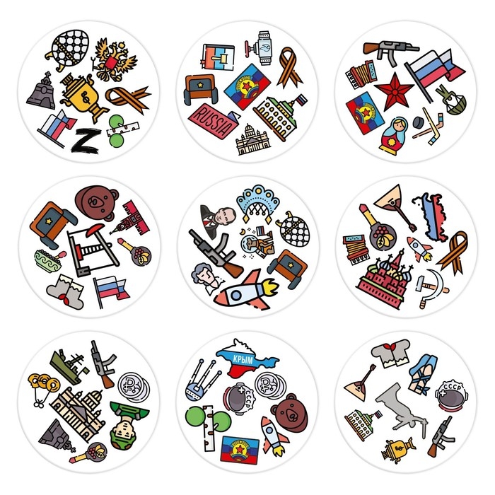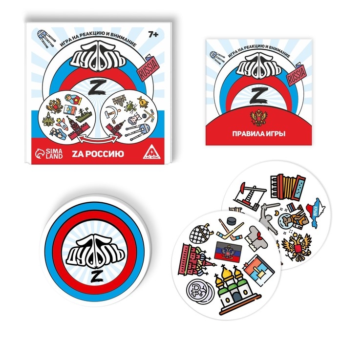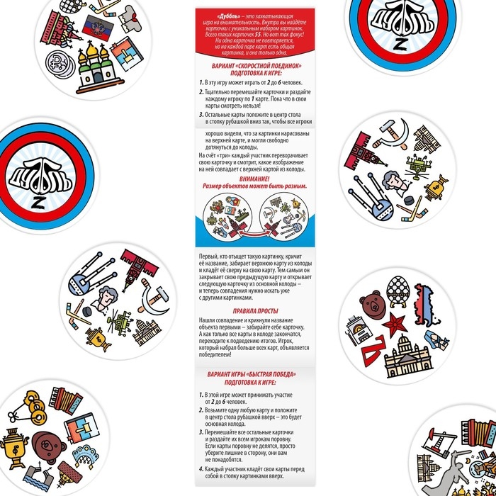 В этой игре есть всё, что близко русским людям, — берёзки, традиции, великие люди, достопримечательности и не только. Внутри вас ждёт 55 карт с уникальным набором картинок. На каждой паре карт есть только одно общее изображение. Его-то вам и нужно найти!