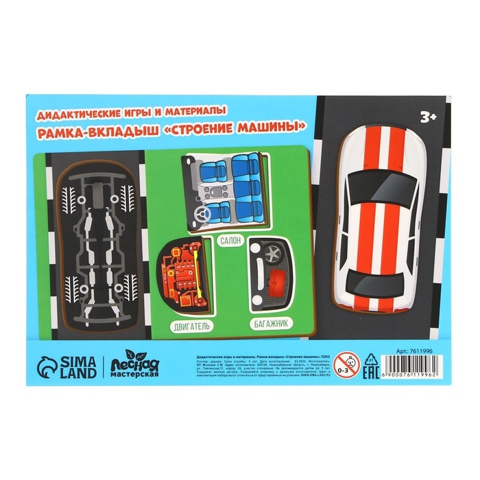 - Рамка-вкладка состоит из 4 вынимающихся деталей: кузова, салона, двигателя, багажника.