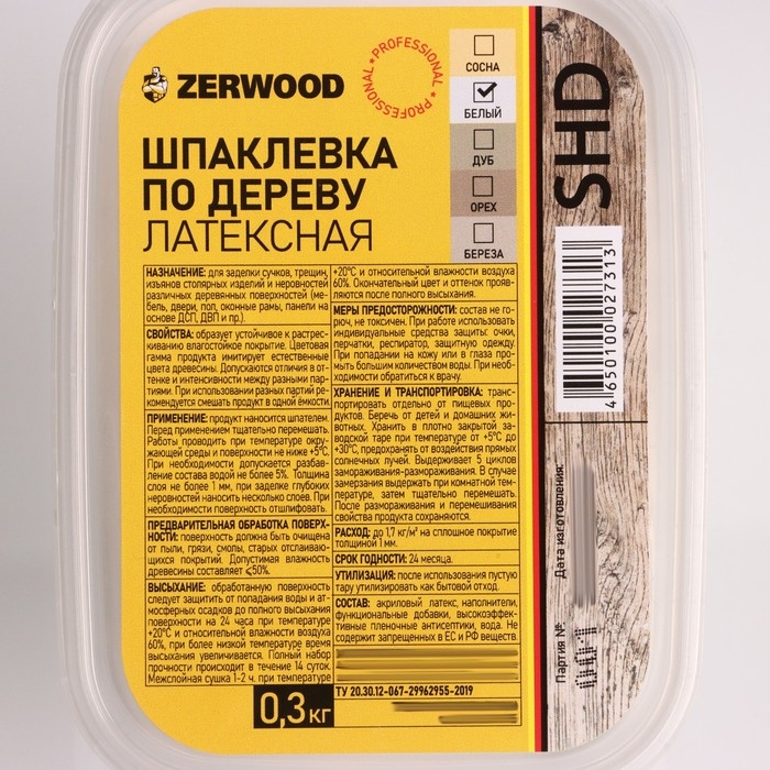 Шпаклевка ZERWOOD SHD по дереву латексная белая 0,3кг