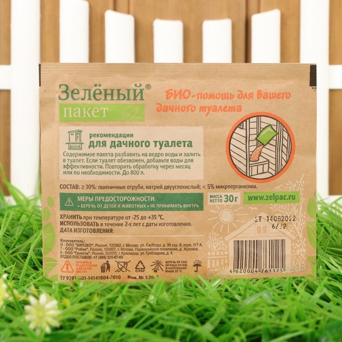 Зеленый пакет для дачного туалета применяется для ускорения процессов разложения и уменьшения объема отходов. Нейтрализует неприятный запах. Подходит для обработки уличных туалетов, труб, сточных ям, установок очистки канализационных сточных вод и биотуалетов.