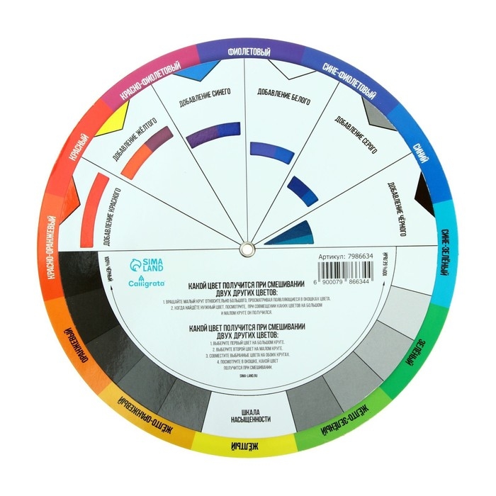 Первая сторона цветового круга содержит гид по смешению цветов для художников и шкалу насыщенности.