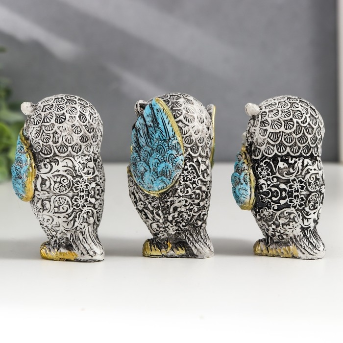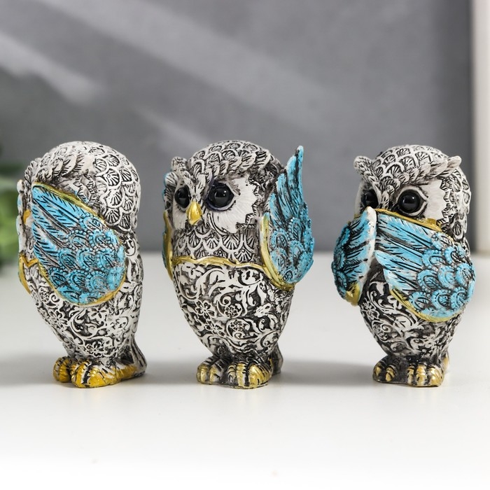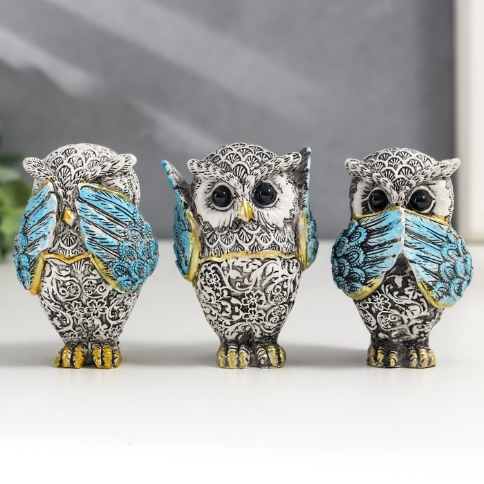 Сувенир полистоун "Филин - не вижу, не слышу, не скажу" серо-голубой МИКС 7х4,5х3,5 см