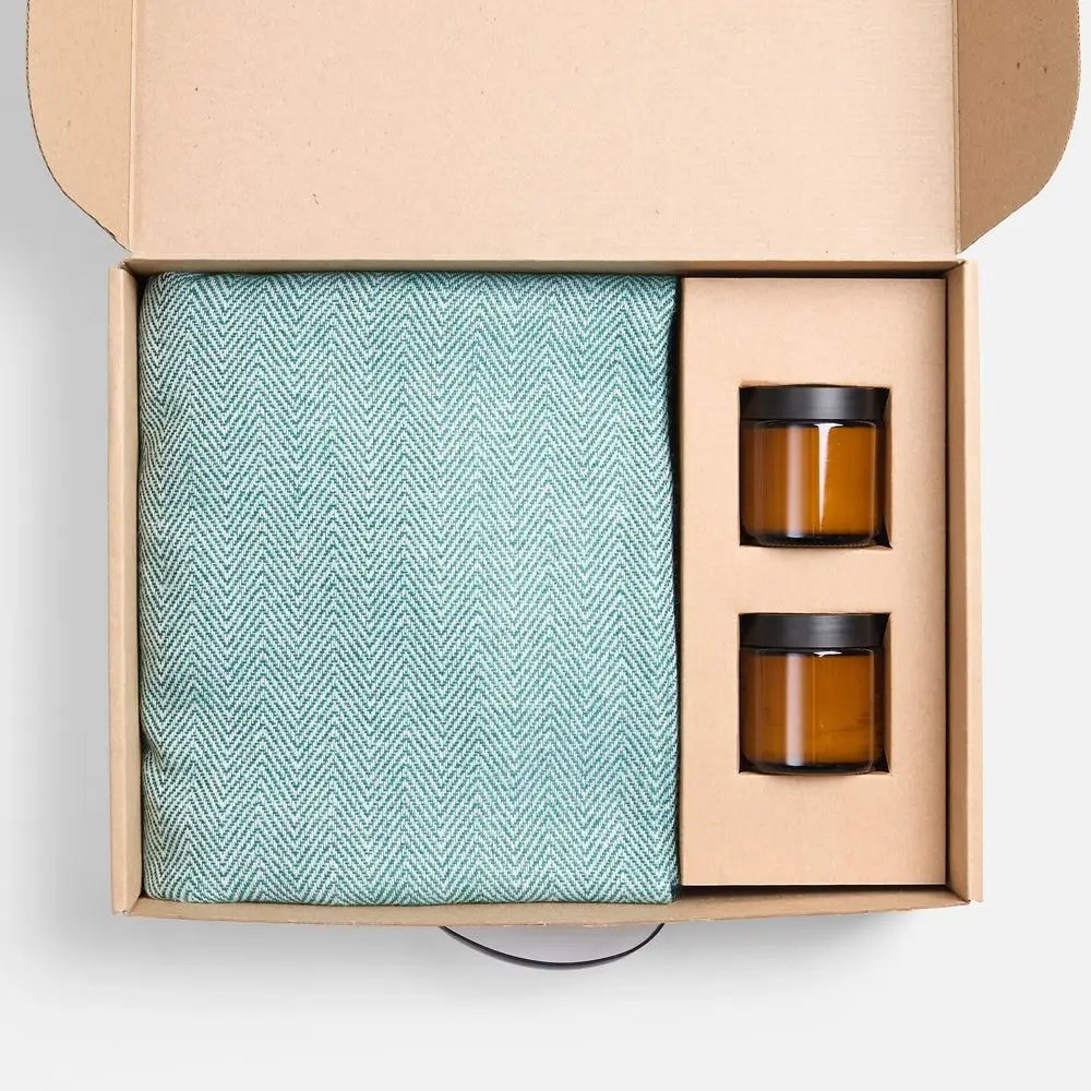 Мягкий плед с нежной бахромой станет идеальным спутником для расслабляющих вечеров, создавая комфорт и стильный облик в любом интерьере. Две ароматические свечи в элегантных стеклянных баночках наполнят пространство расслабляющим мягким светом и тонким ароматом, добавляя нотки спокойствия и гармонии.