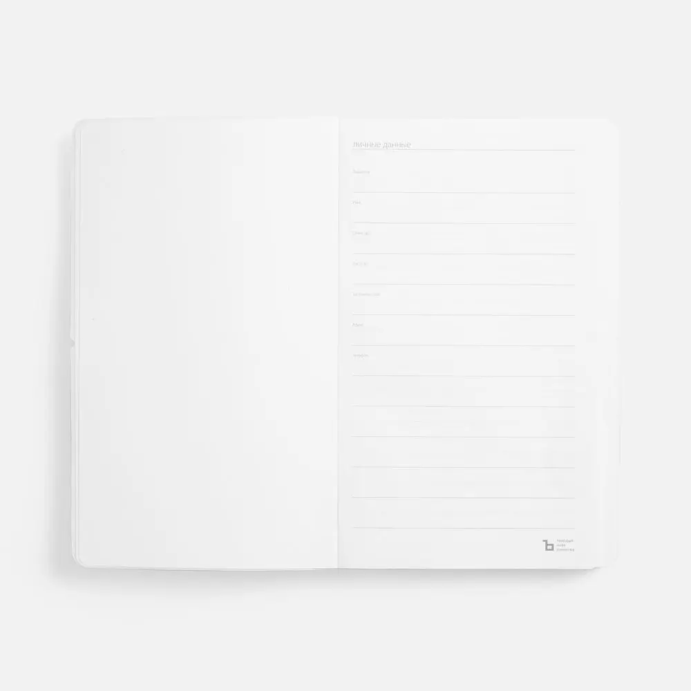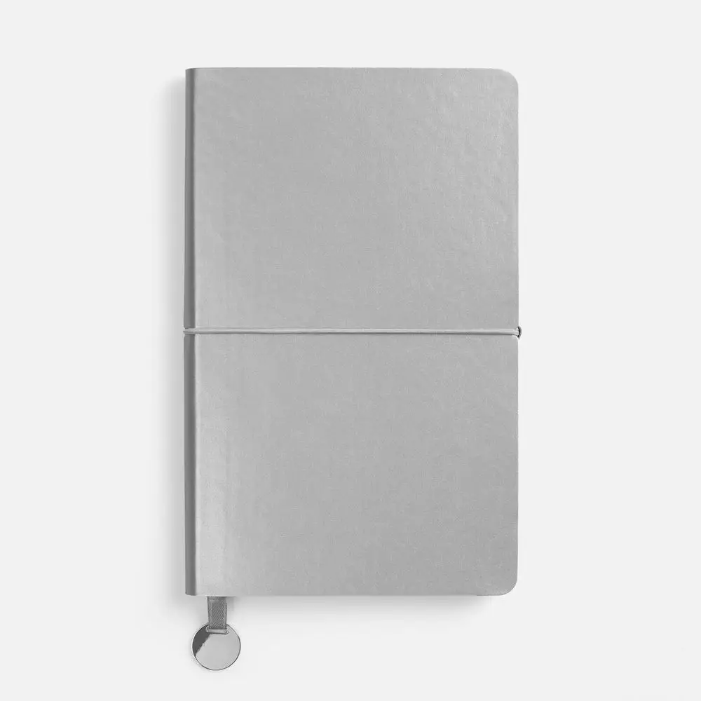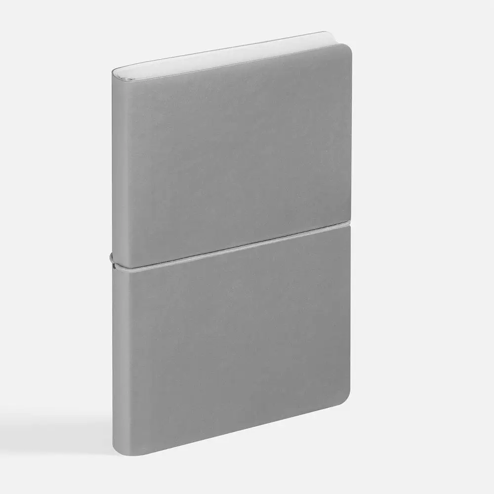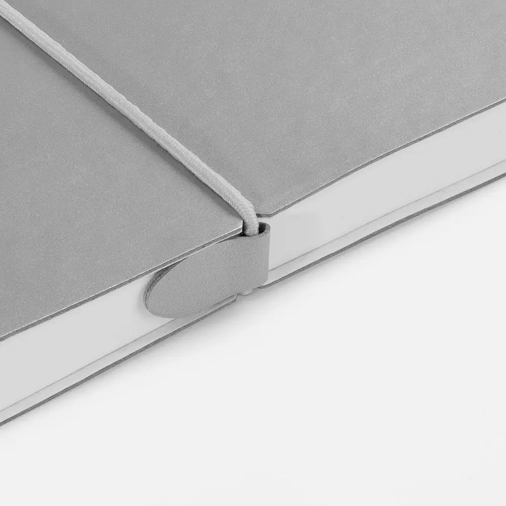 Ежедневник с гибкой обложкой, выполнен из материала Waltz, серебристый DD, дополнен ляссе в цвет обложки с металлическим шильдом.