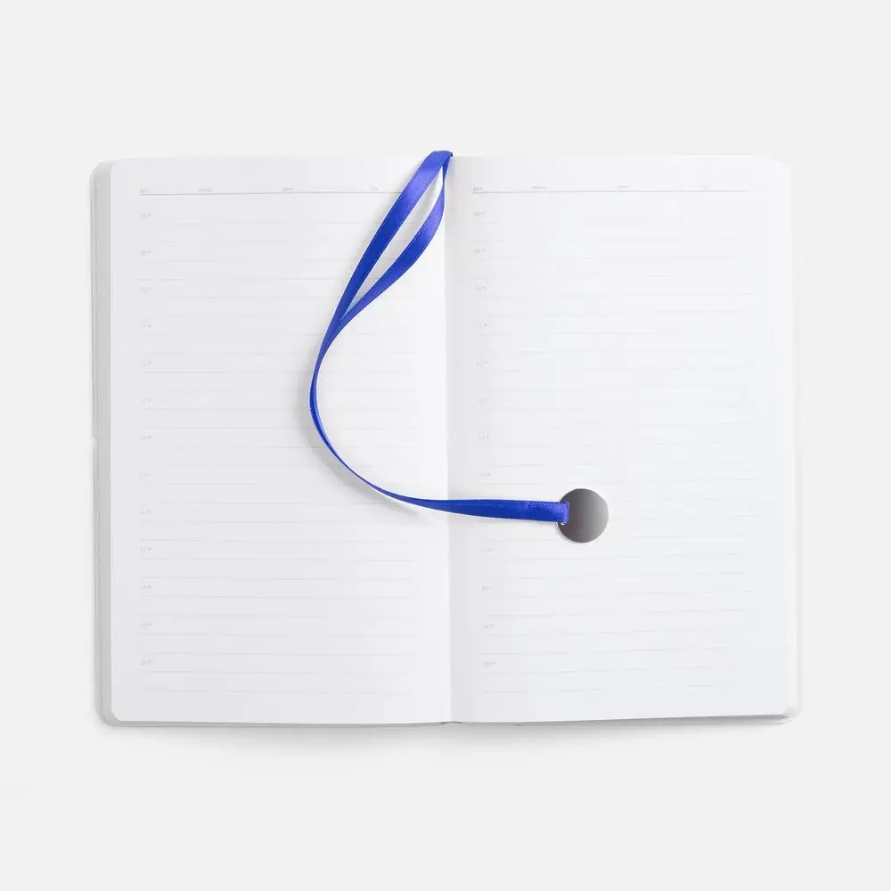 Ежедневник с гибкой обложкой, выполнен из материала Waltz, синий НН, дополнен ляссе в цвет обложки с металлическим шильдом.