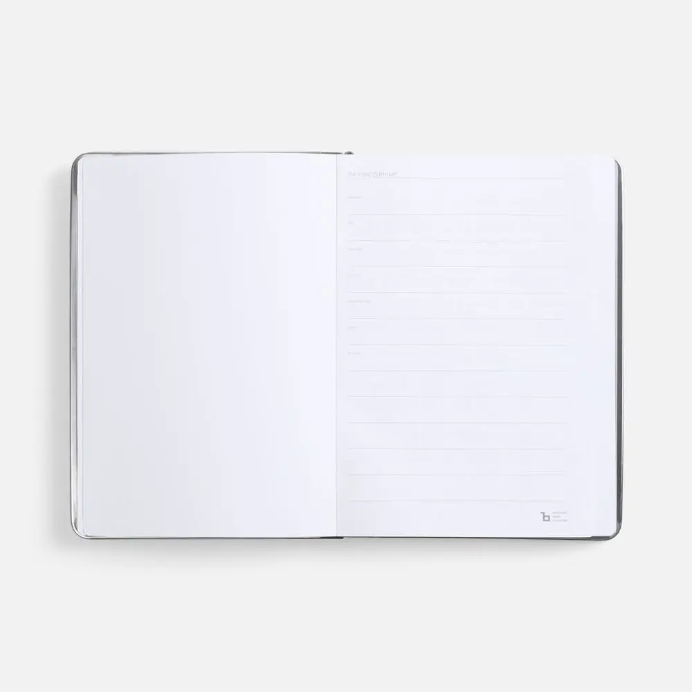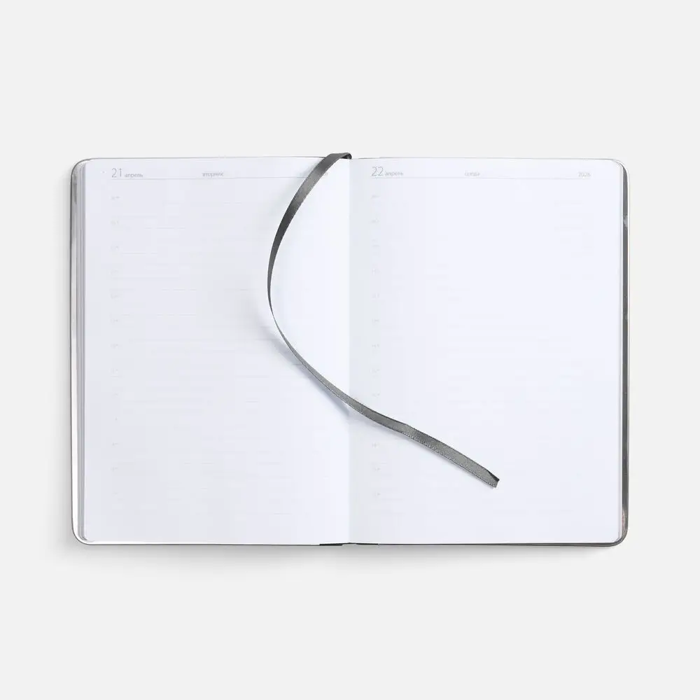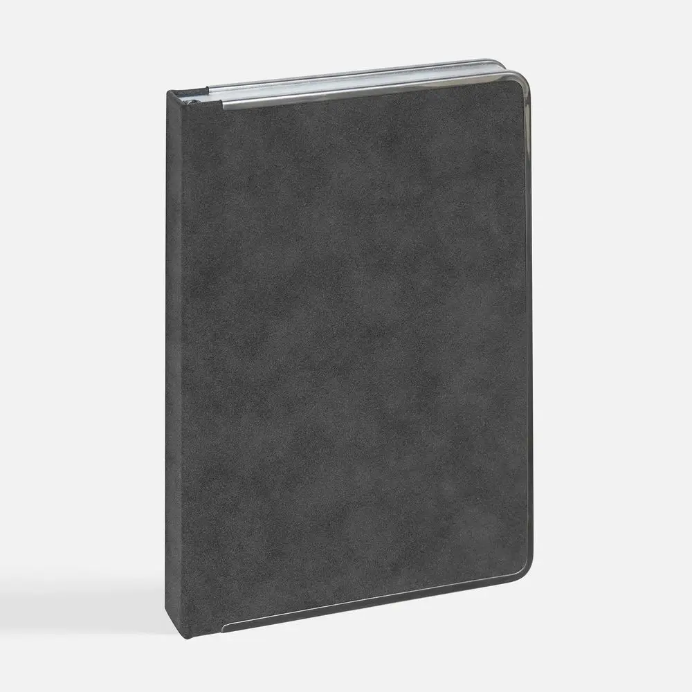 Ежедневник с твердой обложкой и серебристым обрезом блока. Выполнен из материала Nubuck, темно-серый ЕЕ, дополнен серым ляссе и металлическими рамками с двух сторон обложки.