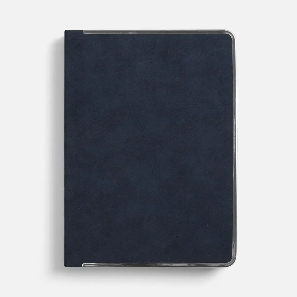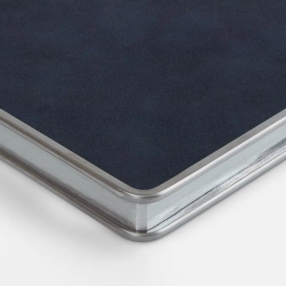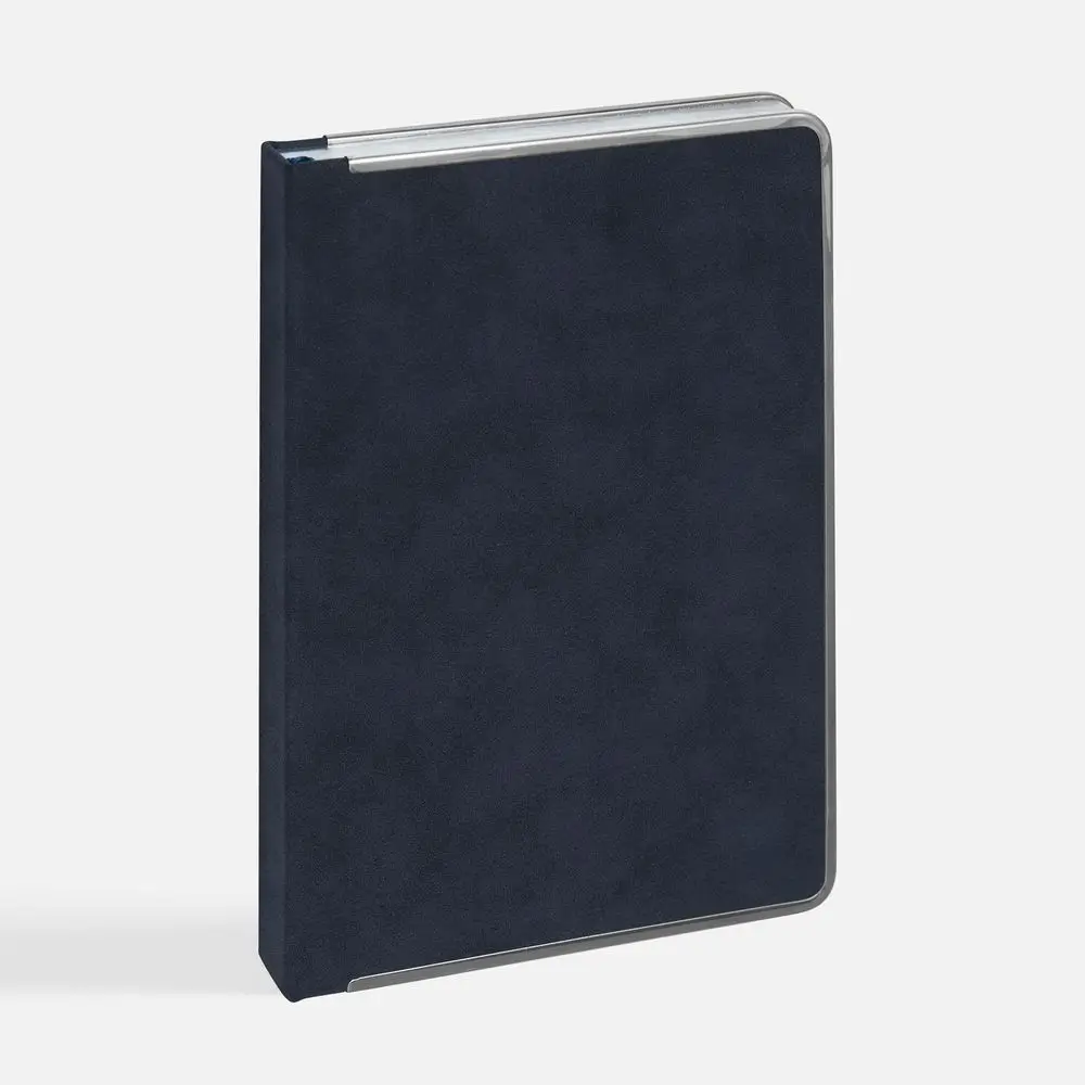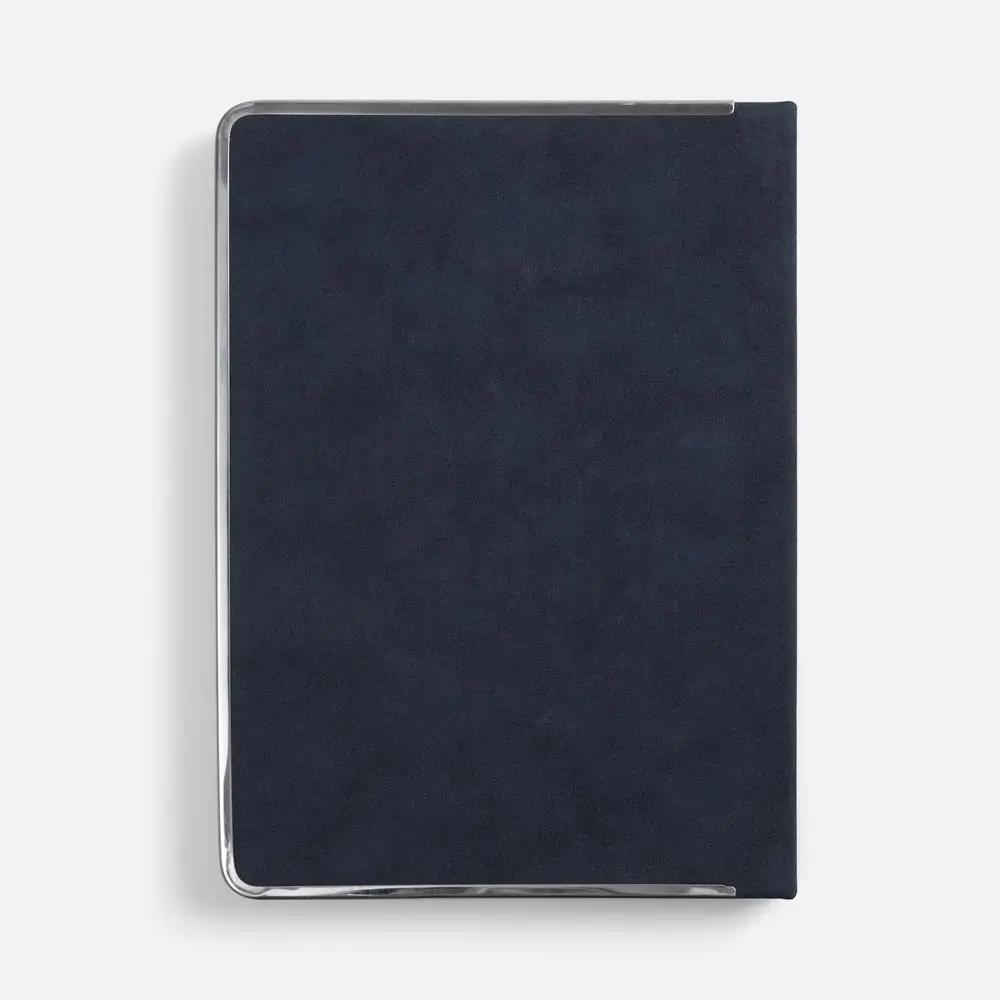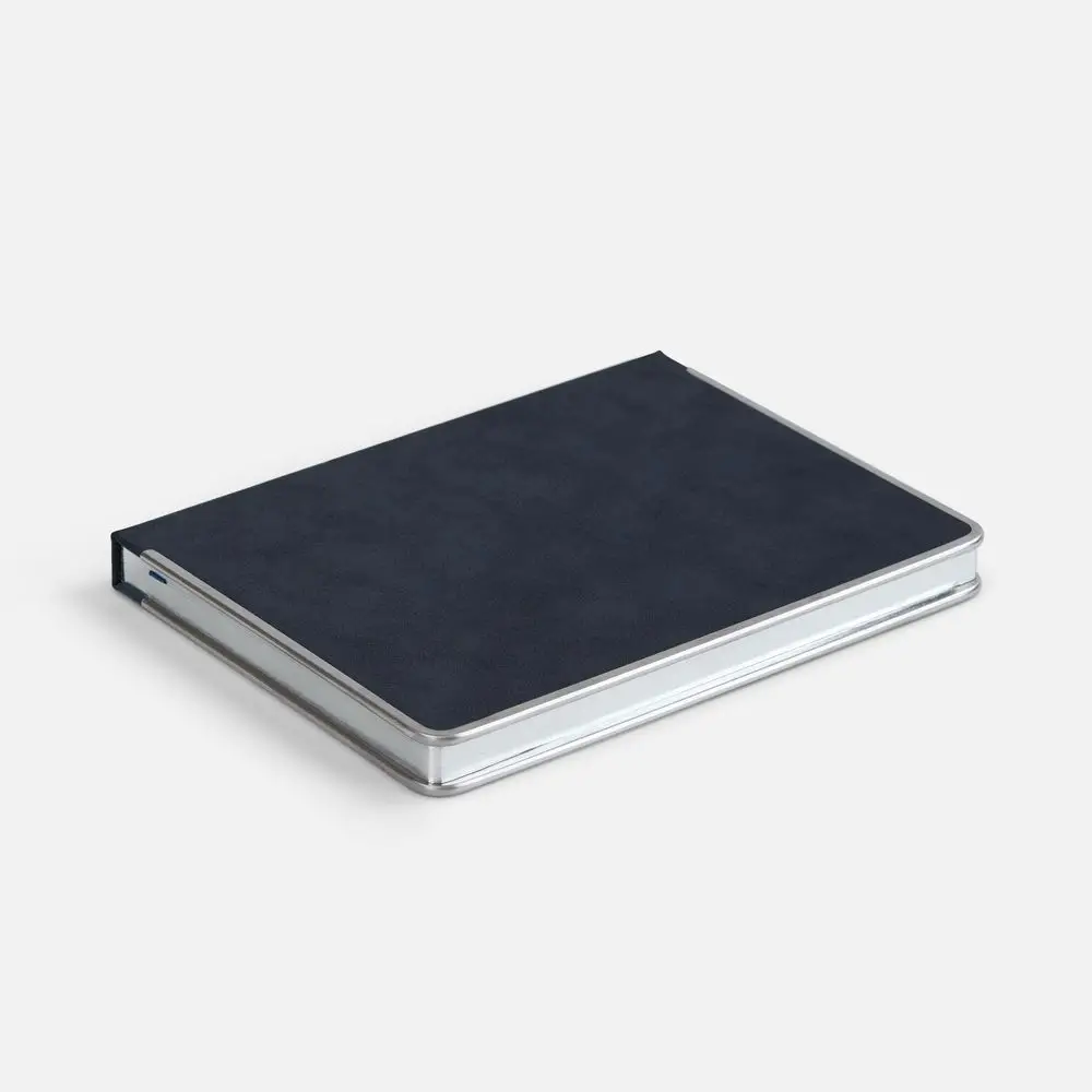 Ежедневник с твердой обложкой и серебристым обрезом блока. Выполнен из материала Nubuck, темно-синий ХХ, дополнен синим ляссе ляссе и металлическими рамками с двух сторон обложки.