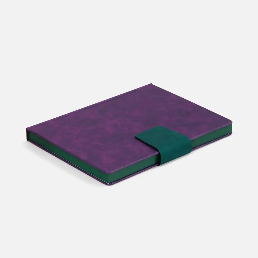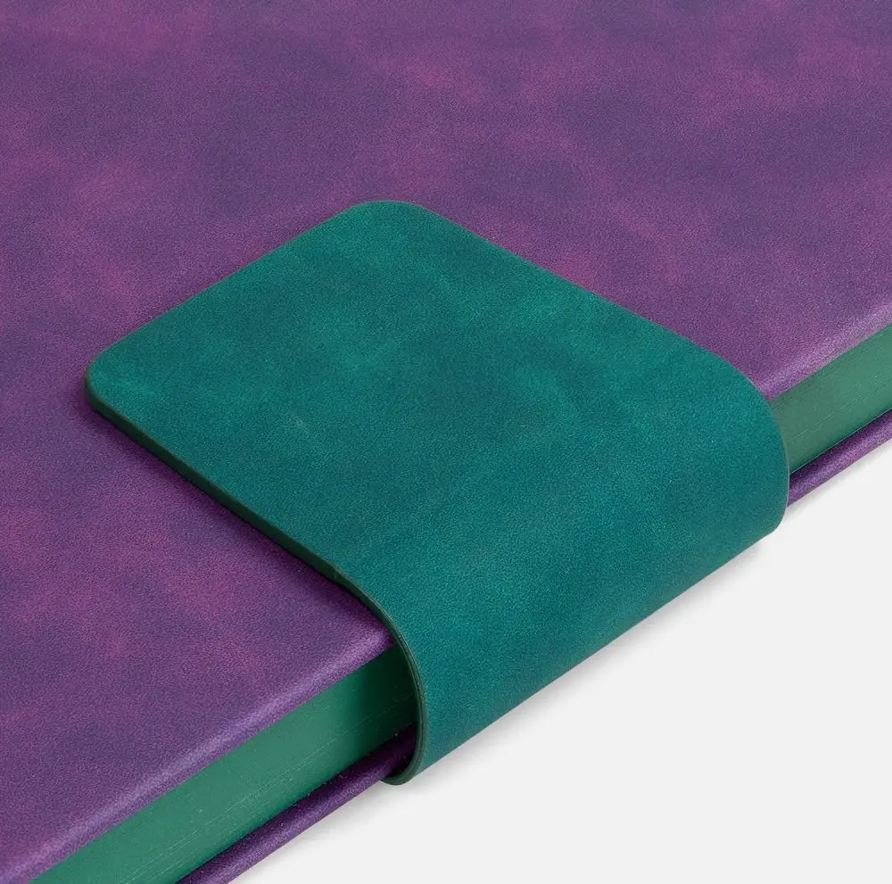 Ежедневник с твердой обложкой, выполнен из материала Nubuck Touch, фиолетовый UU, дополнен капталом, ляссе и обрезом синего цвета. Застежка — хлястик на магните из материала Nubuck Touch, темно-зеленый VV.