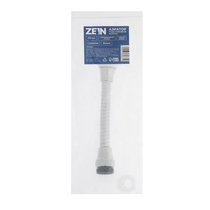 Аэратор ZEIN, с регулировкой потока, на гибком шланге,190мм, 3 режима, пластик, белый