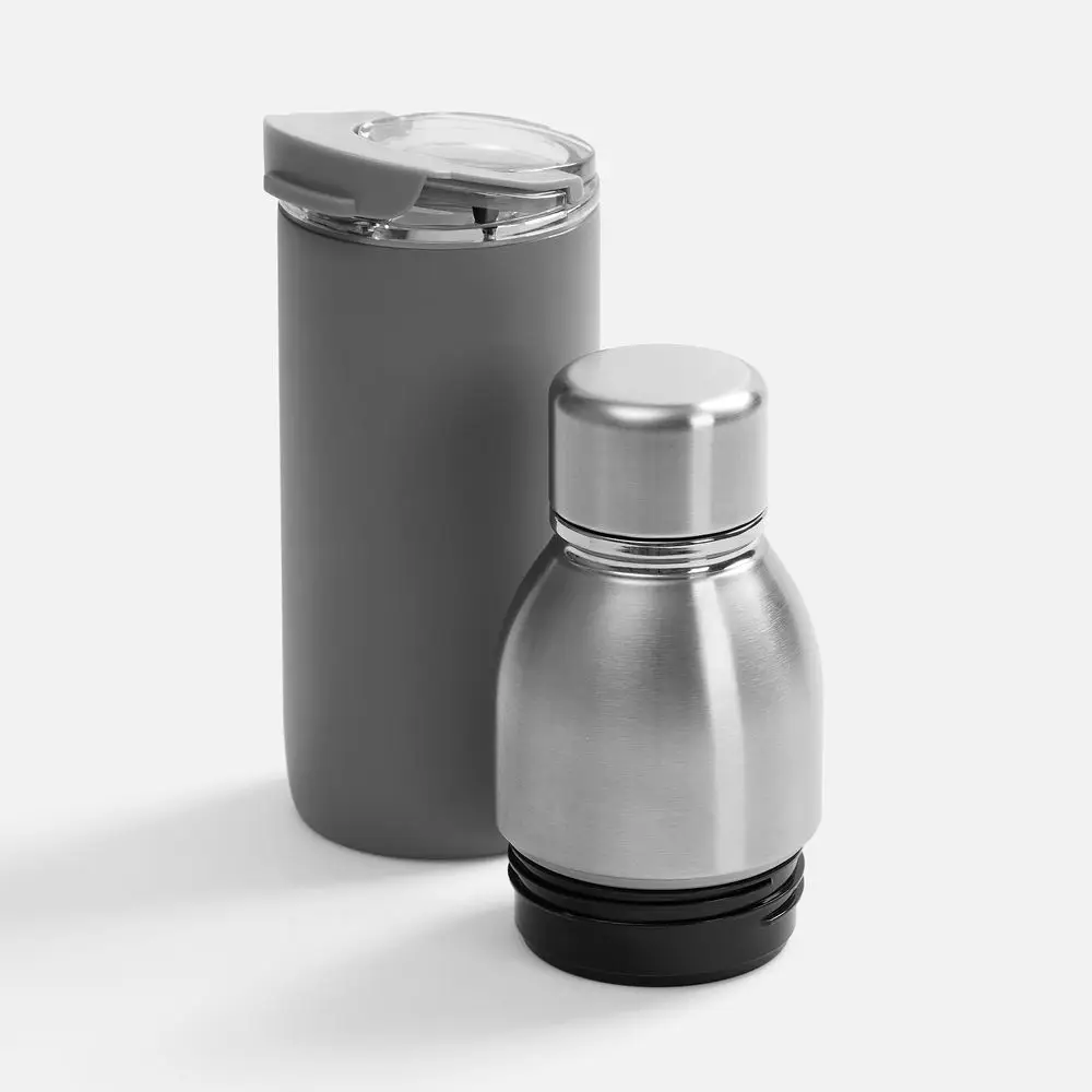 Varianti — это яркий пример посуды с двойной функциональностью. Один и тот же корпус можно превратить как в термостакан для чая и кофе с пластиковой крышкой, так и в термобутылку для прохладительных напитков со стальной крышкой.