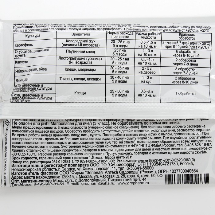 Биопрепарат для борьбы с вредителями на овощных, ягодных, плодовых и декоративных культурах. Гарантирует получение экологически чистой, безопасной для здоровья продукции. Может применяться в любую фазу развития растений. Действует избирательно в отношении широкого спектра вредителей.