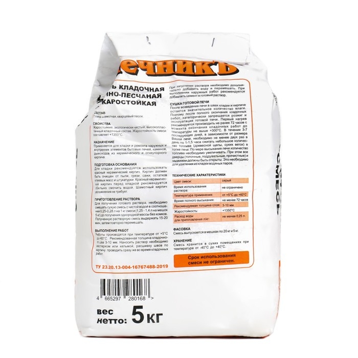 Смесь кладочная глино-песчаная жаростойкая "Печникъ" 5,0 кг