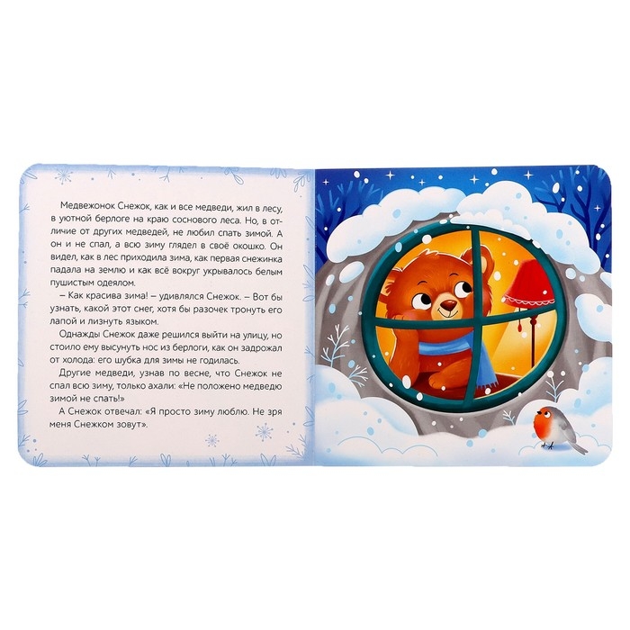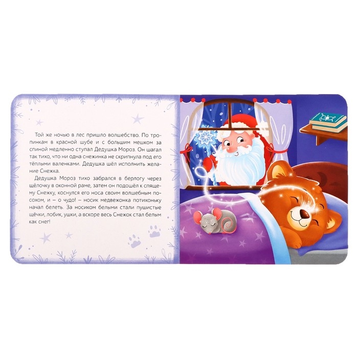 Медвежонок Снежок так сильно любил зиму, что никогда не впадал в спячку. Он мечтал о тёплой шубке, в которой можно было гулять по заснеженным лесным тропинкам и валяться в пушистых сугробах. И Дедушка Мороз подарил медвежонку снежную шубку. Ведь в Новый год сбываются все желания!