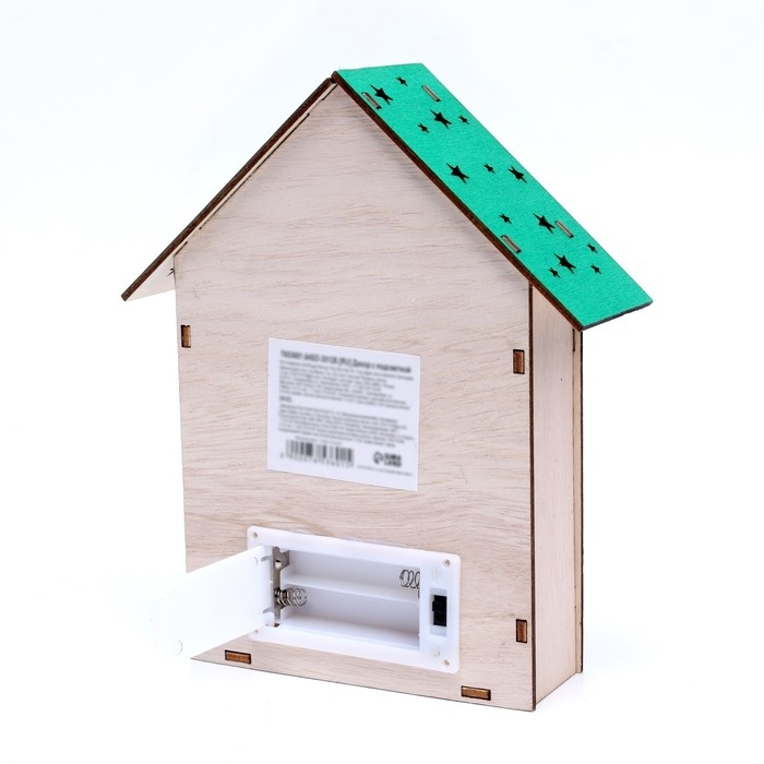 Изделие выполнено из экологичного материала — дерева и работает от батареек.