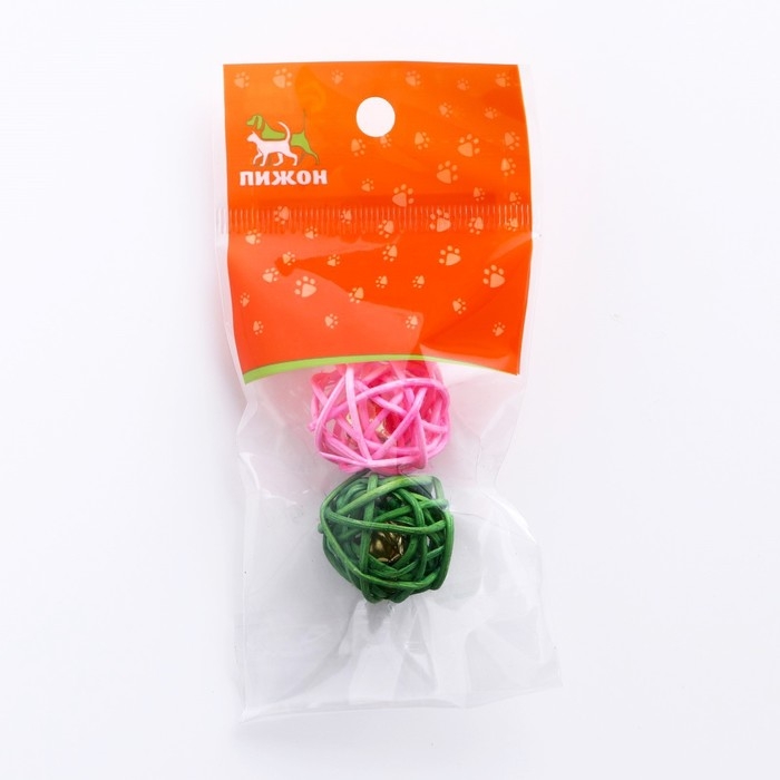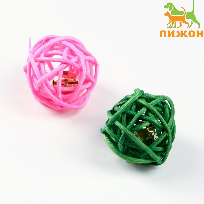 Набор из 2 плетёных шариков из лозы с бубенчиком, 3 см, розовый/зелёный