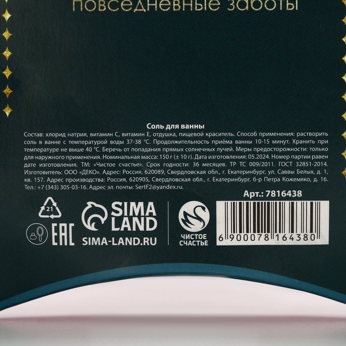 Соль для ванны «С 8 Марта!», 150 г, аромат миндаля в молоке, ЧИСТОЕ СЧАСТЬЕ